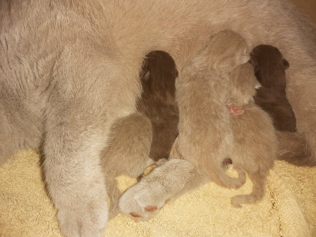 Die Jungen sind beide in der Farbe lilac und heißen Agamemnon und Atréju. 2 der Mädchen haben die Fellfarbe chocolate ( wie der Papa) und hören auf Amaretto und Athanasia, das weibliche lilac Kitten auf den Namen Alrune.