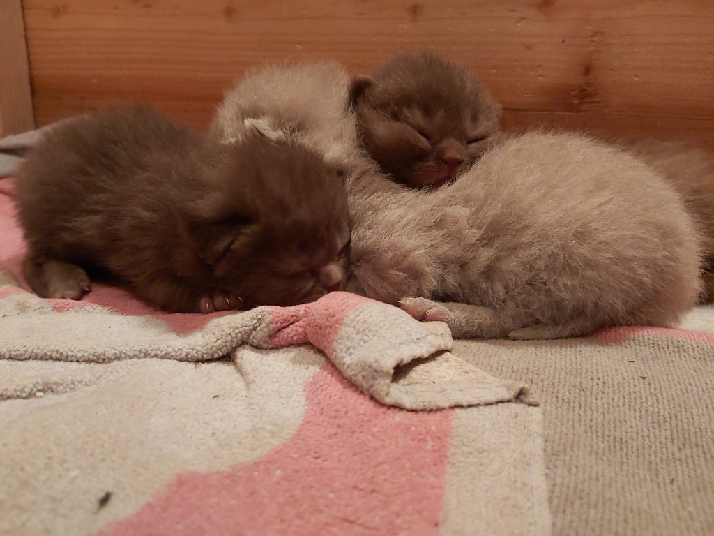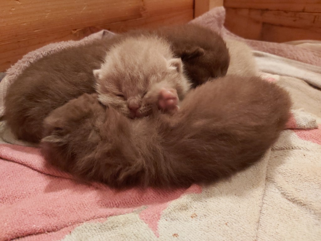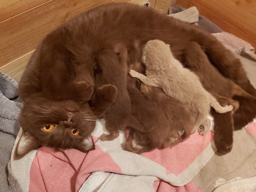 Die BKH-Kitten sind nun 11 Tage alt, 5 an der Zahl. Sie stehen gut im Gewicht, und BKH Chocolate Mama Candy geht es auch gut. Wie es aussieht, sind es 3 BKH Katerchen, 2 in chocolate und 1 in lilac; sowie 2 Mädchen in chocloate tortie.