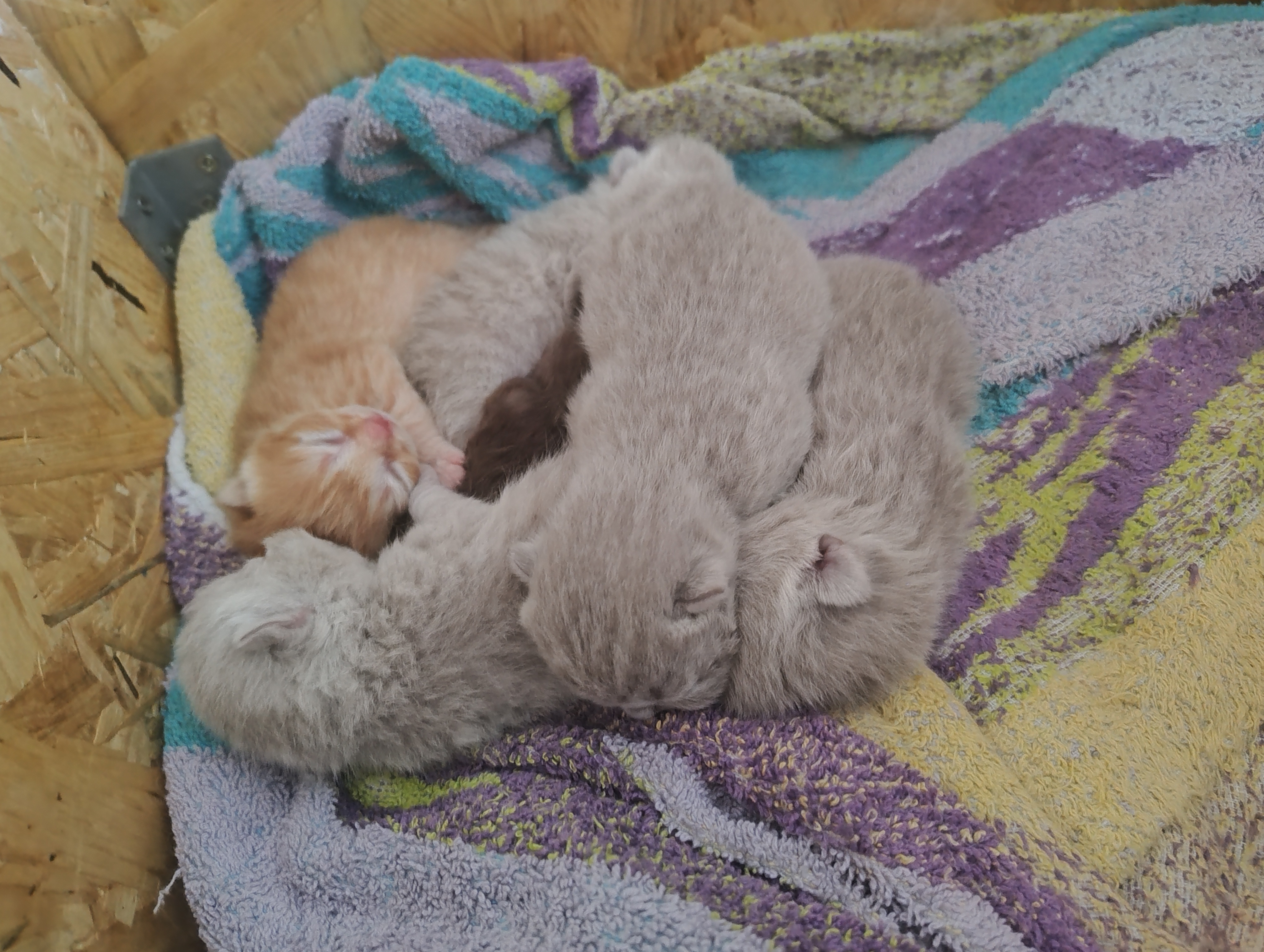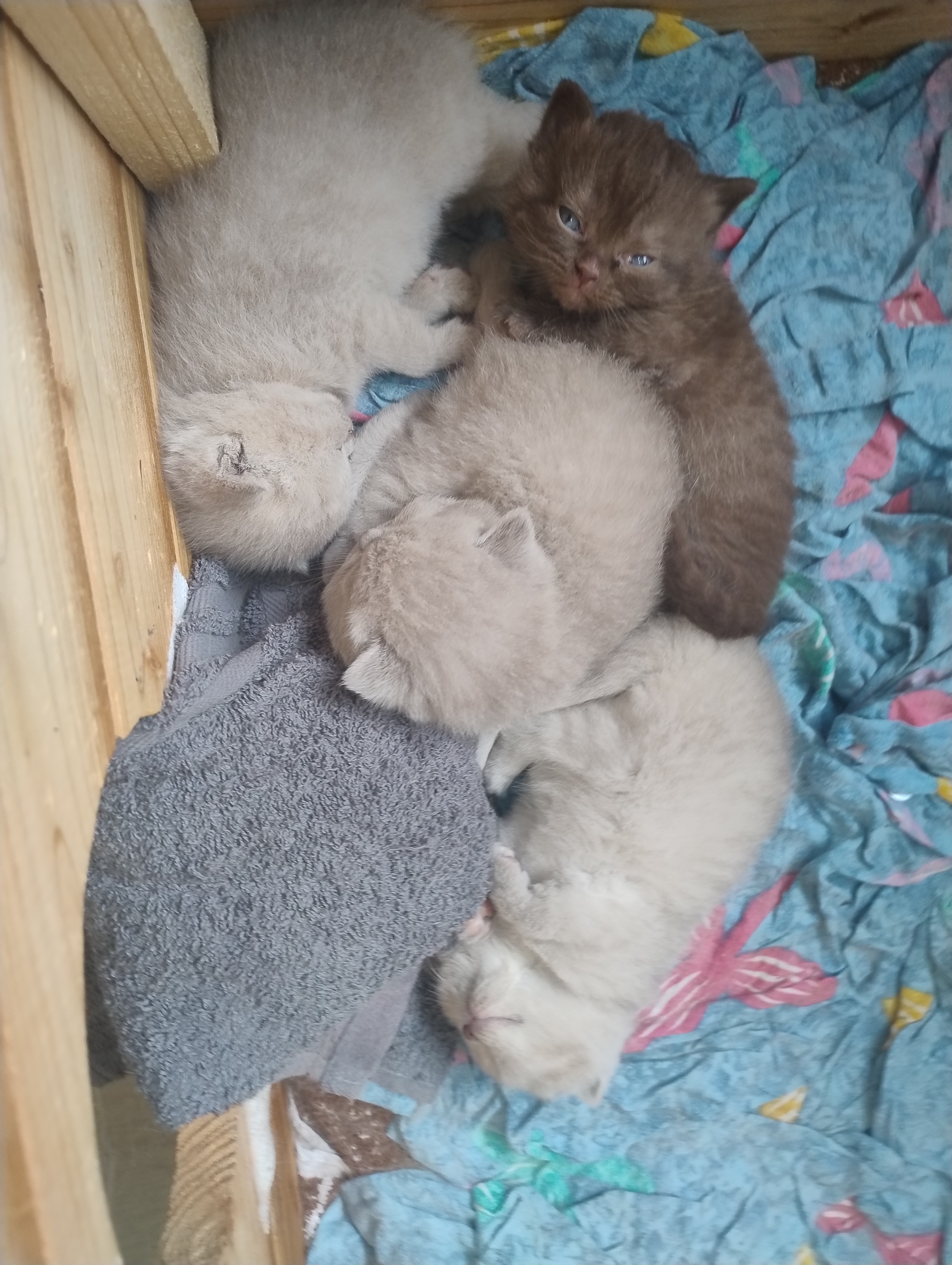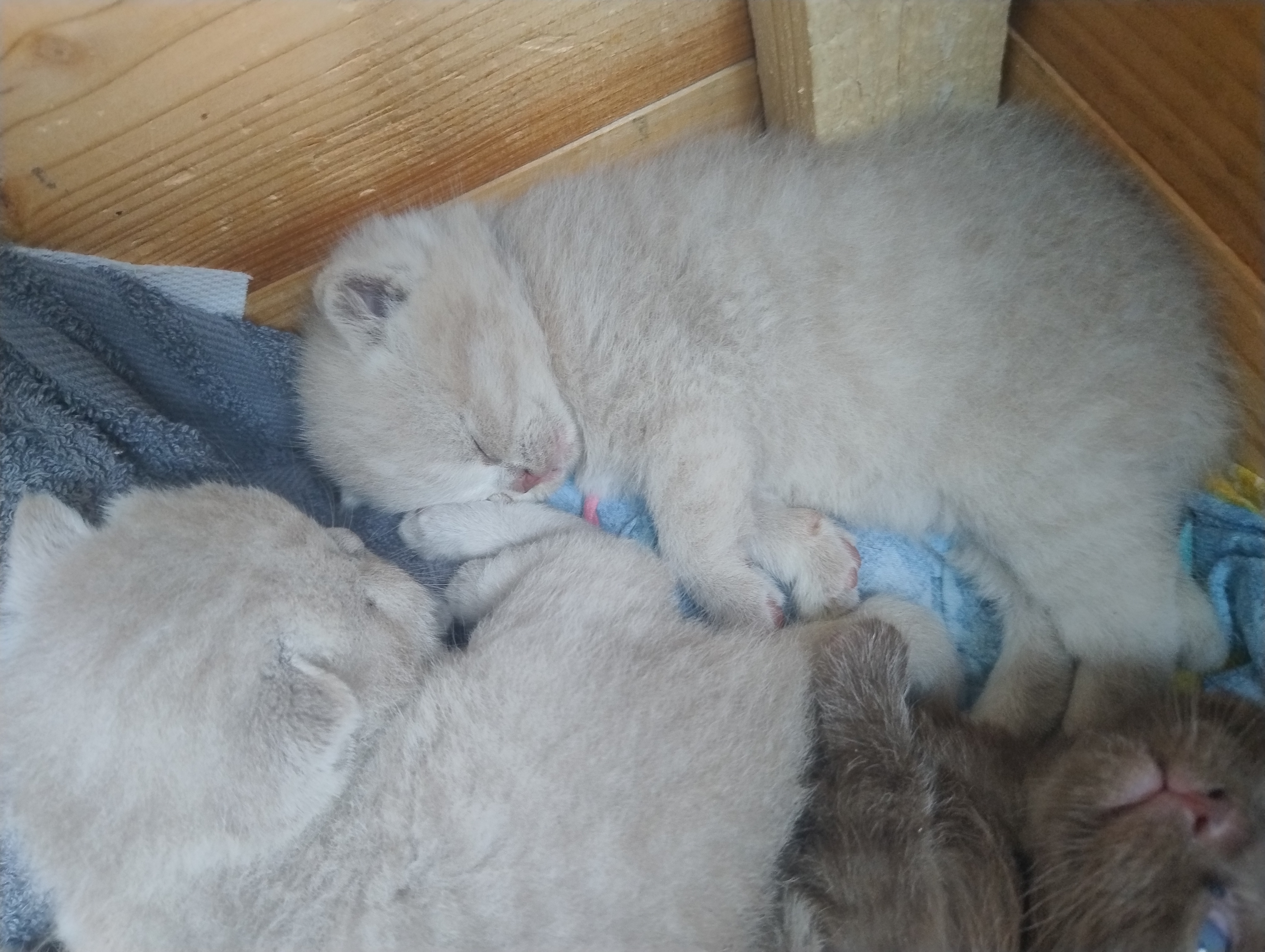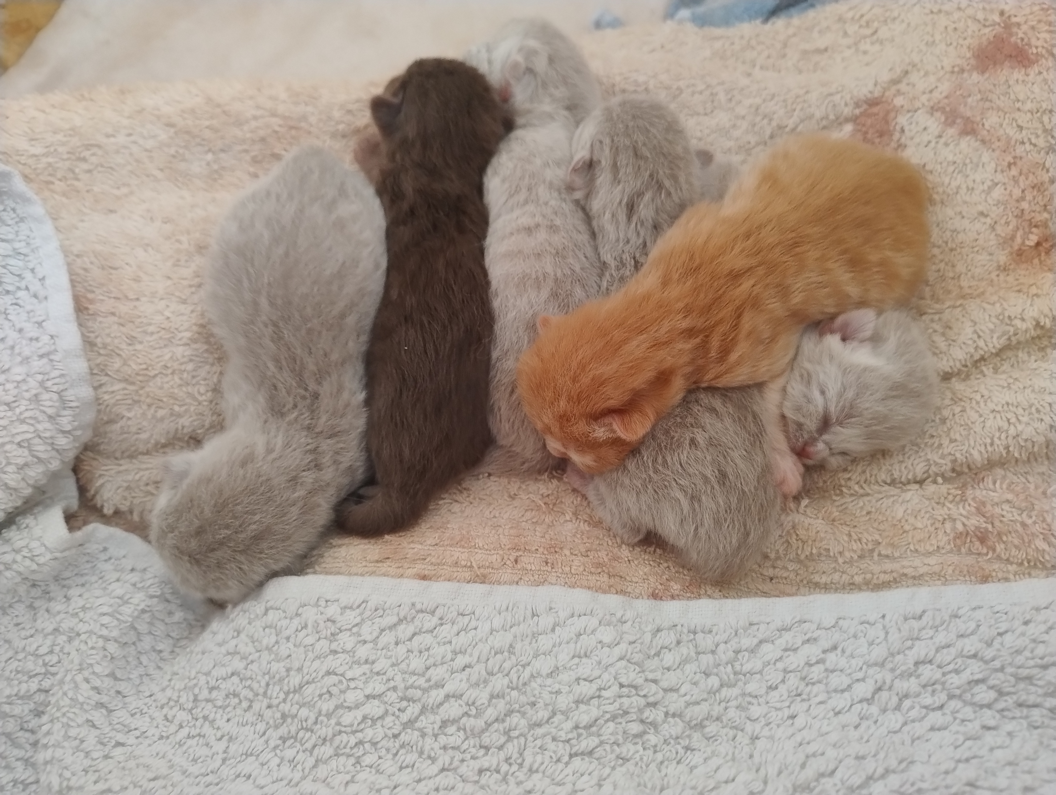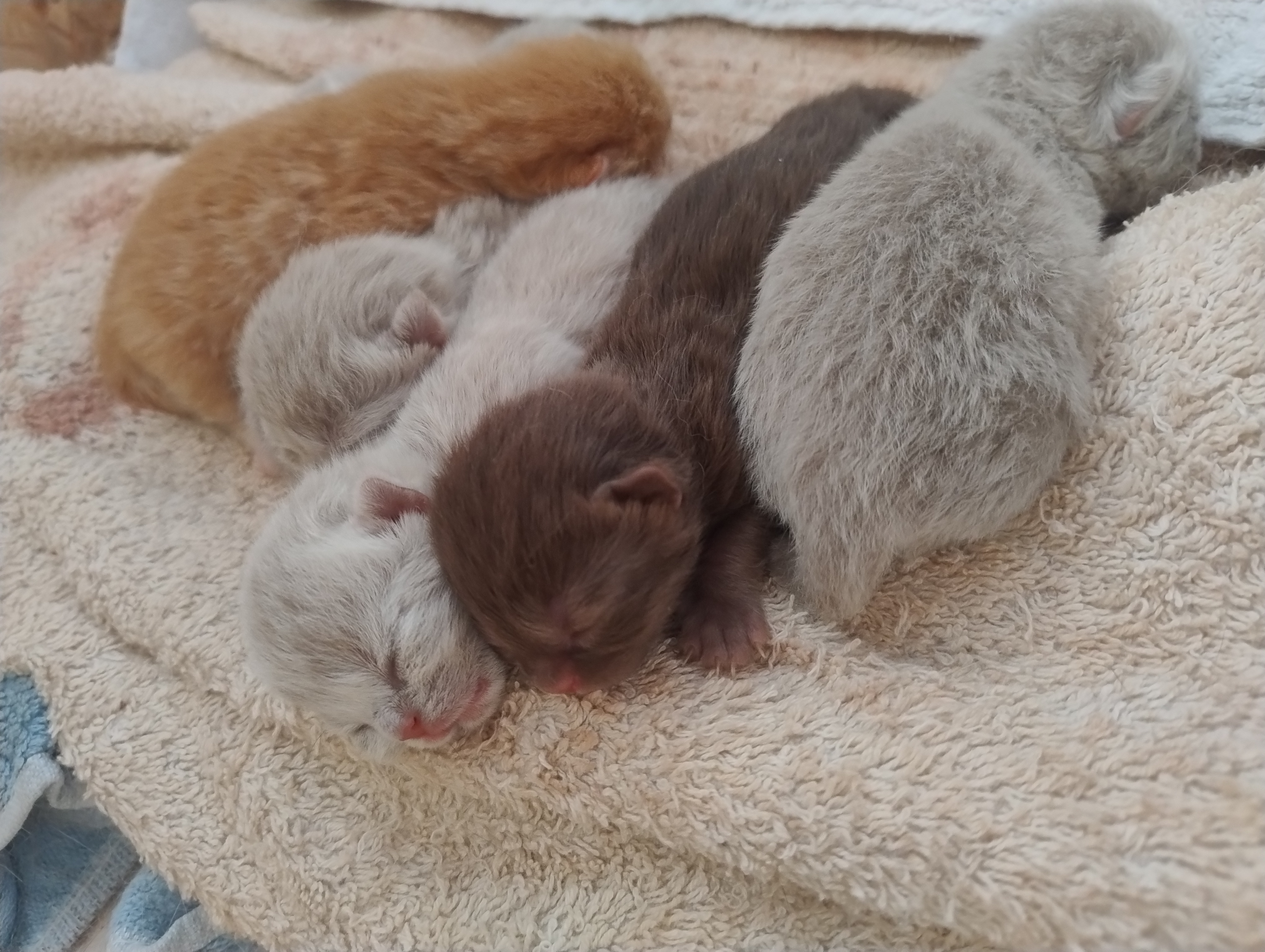 Die kleinen BKHs nehmen gut an Gewicht zu, und es einige Äuglein sind bereits offen, die anderen dabei sich zu öffnen. Mama Dörte geht es auch gut, sie kümmert sich Klasse um ihre Jünglinge.