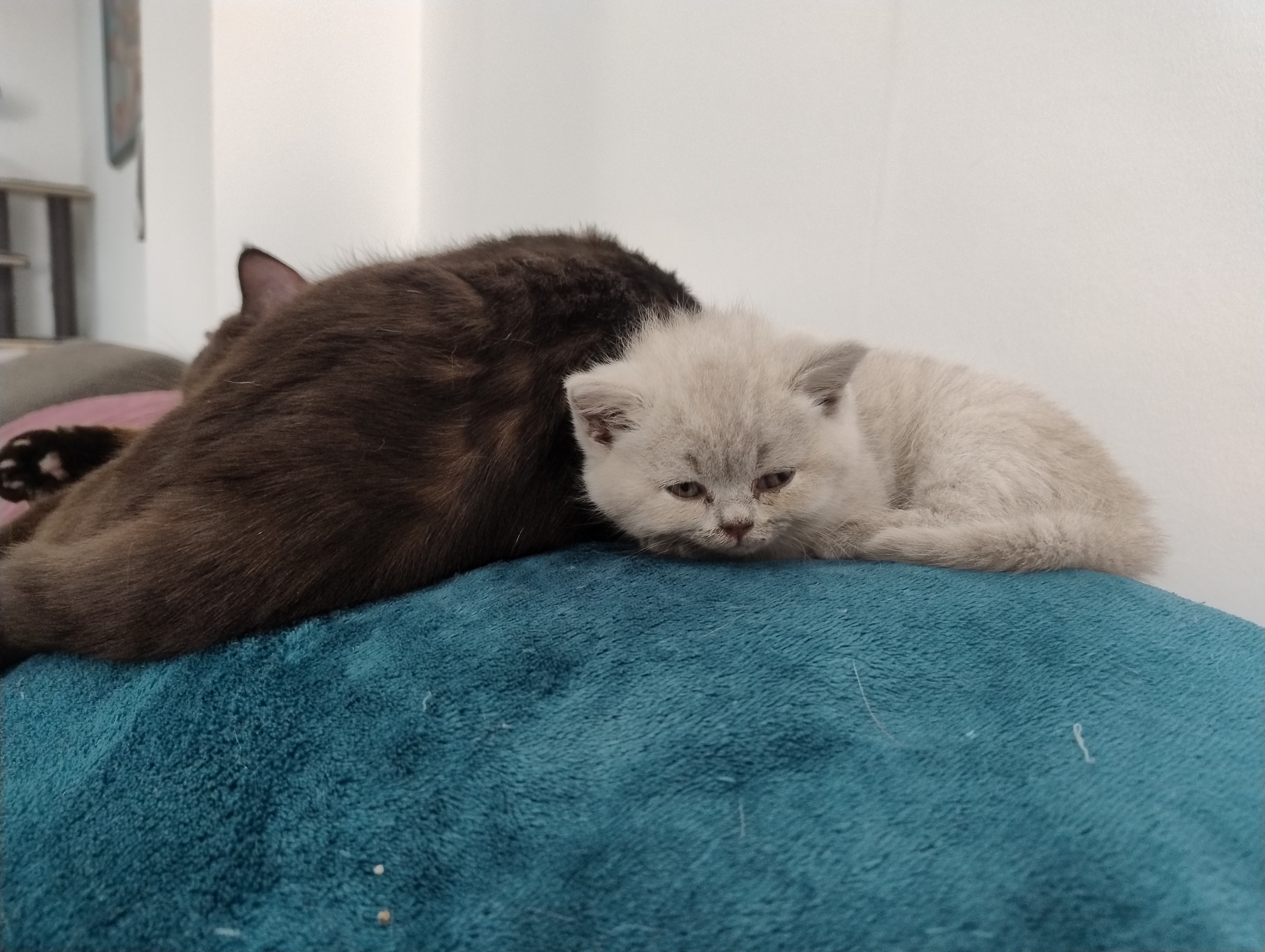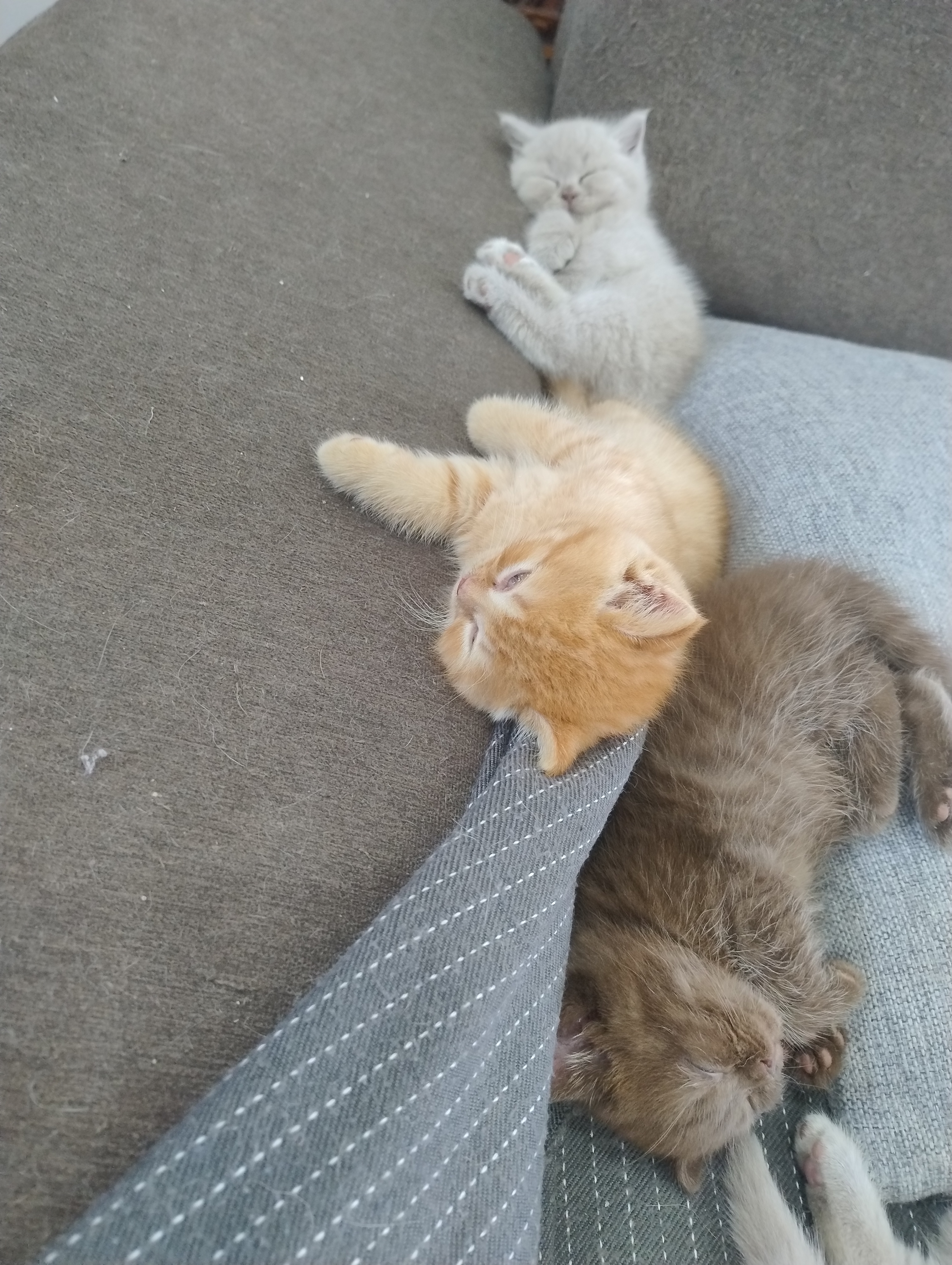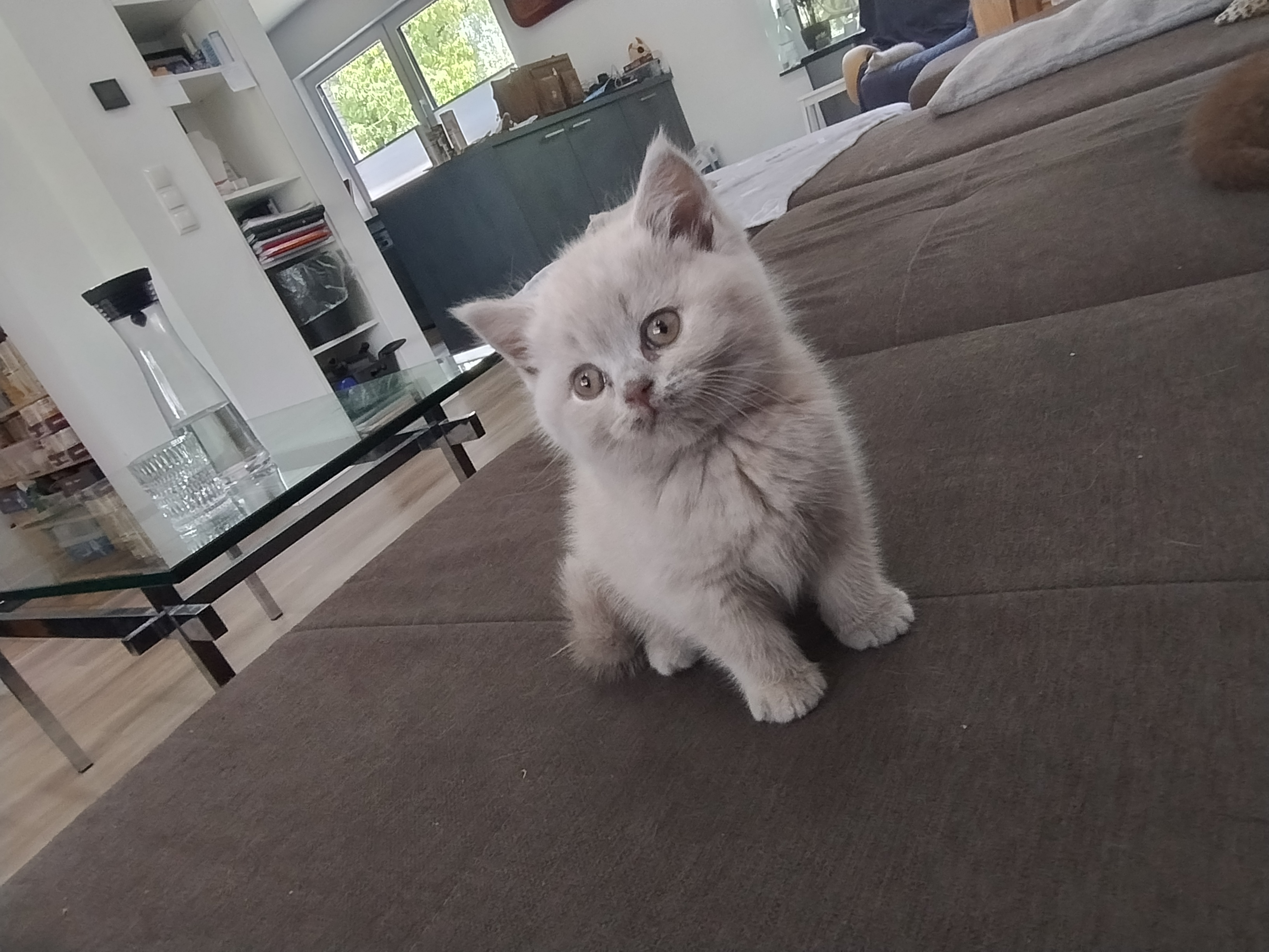 Unsere kleinen G-BKHs sind nun nach unten gezogen und erkunden so langsam im Auslauf das Wohnzimmer. Die „großen Kleinen“ nehmen sie unter ihre Fittiche, und es wird teilweise schon vorsichtig miteinander gespielt, jedoch ist natürlich ausdauertechnisch eine große Differenz da. Unsere Jüngsten beginnen nun auch langsam, sich für Nassfutter zu interessieren. Aber auch hier hat jeder sein eigenes Tempo.