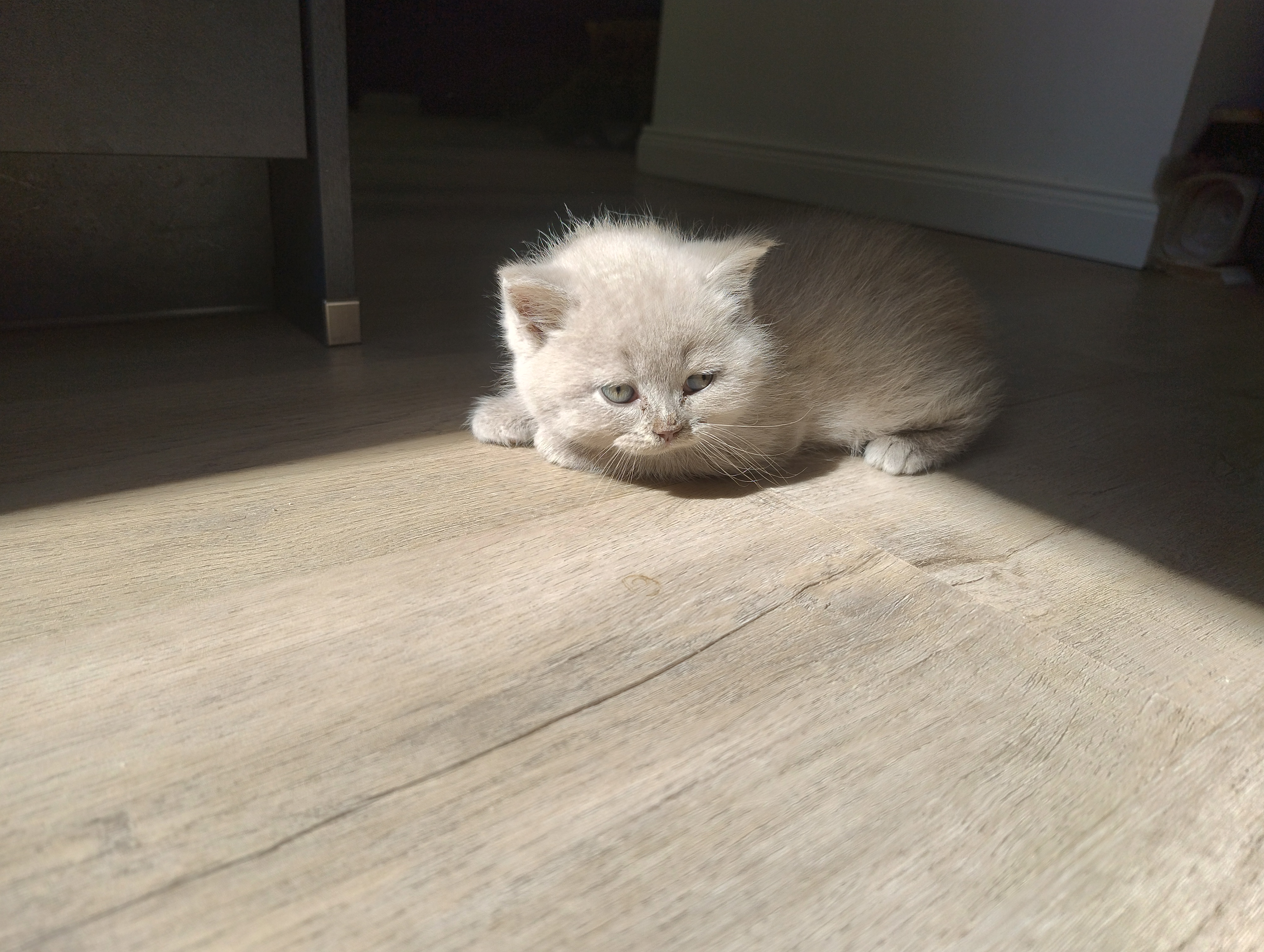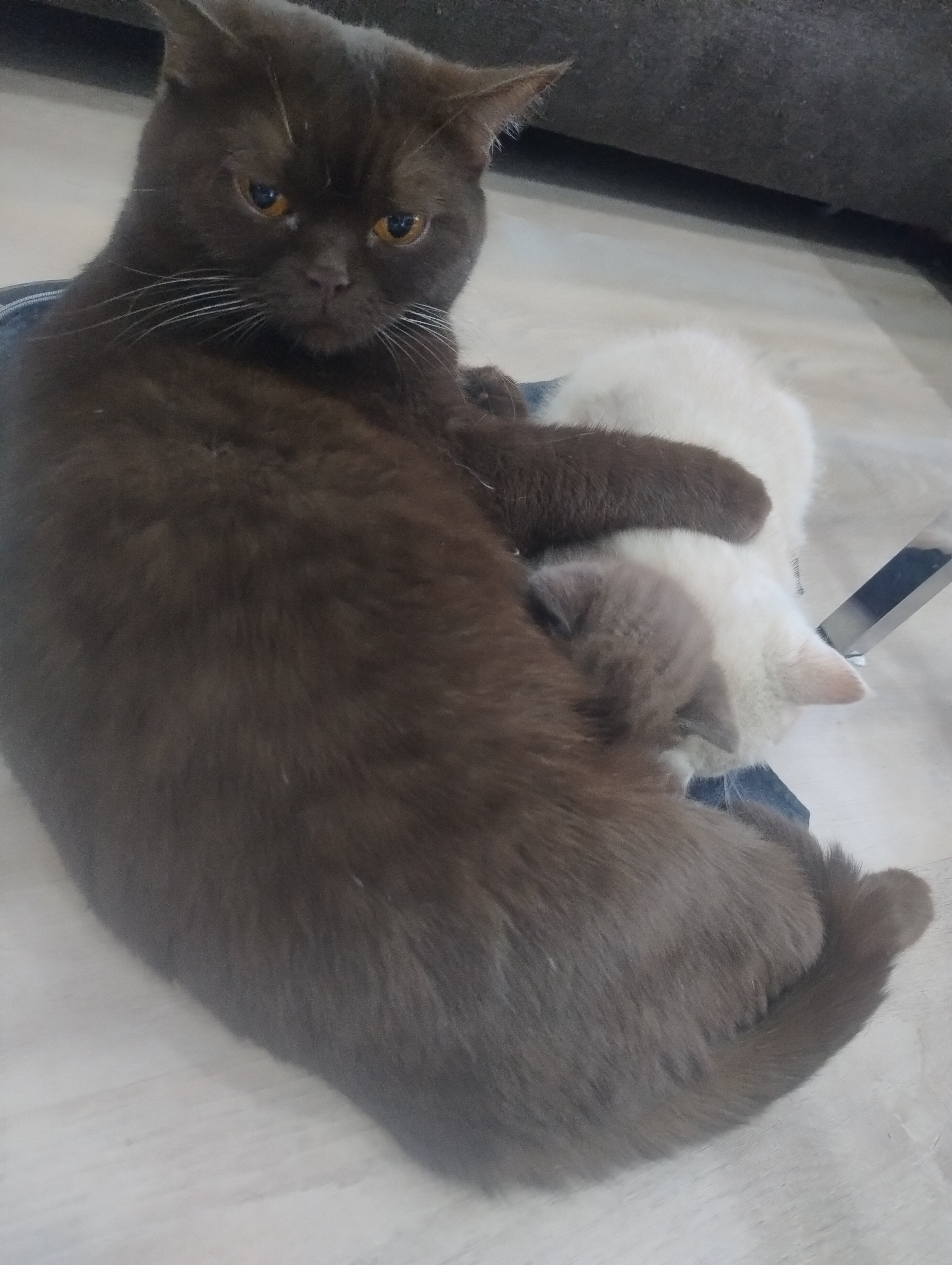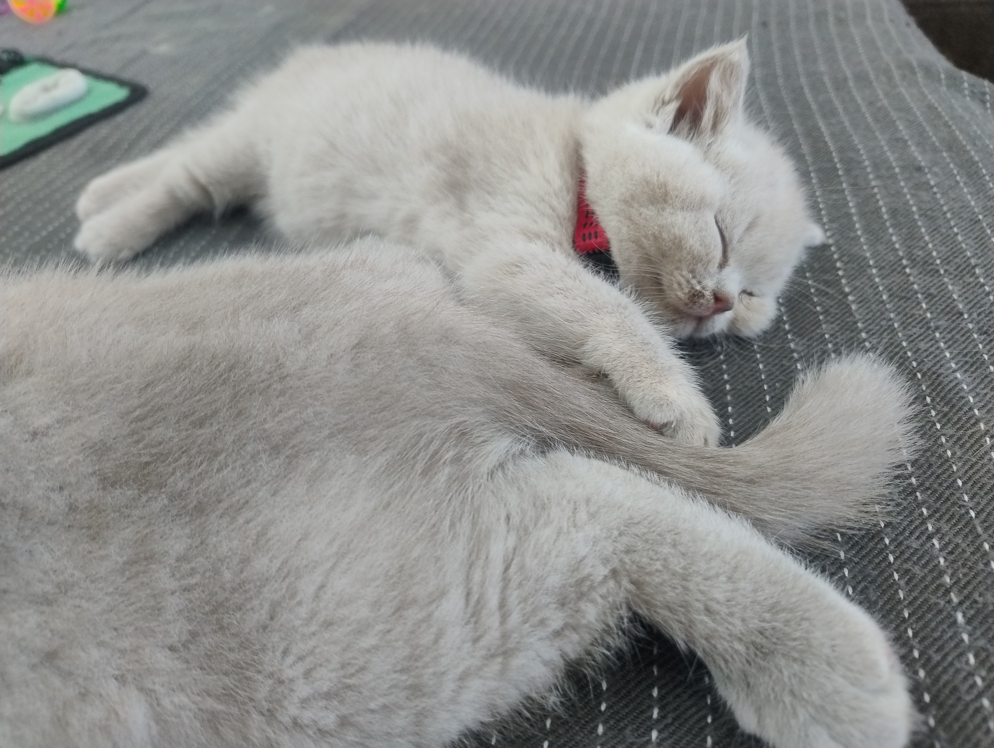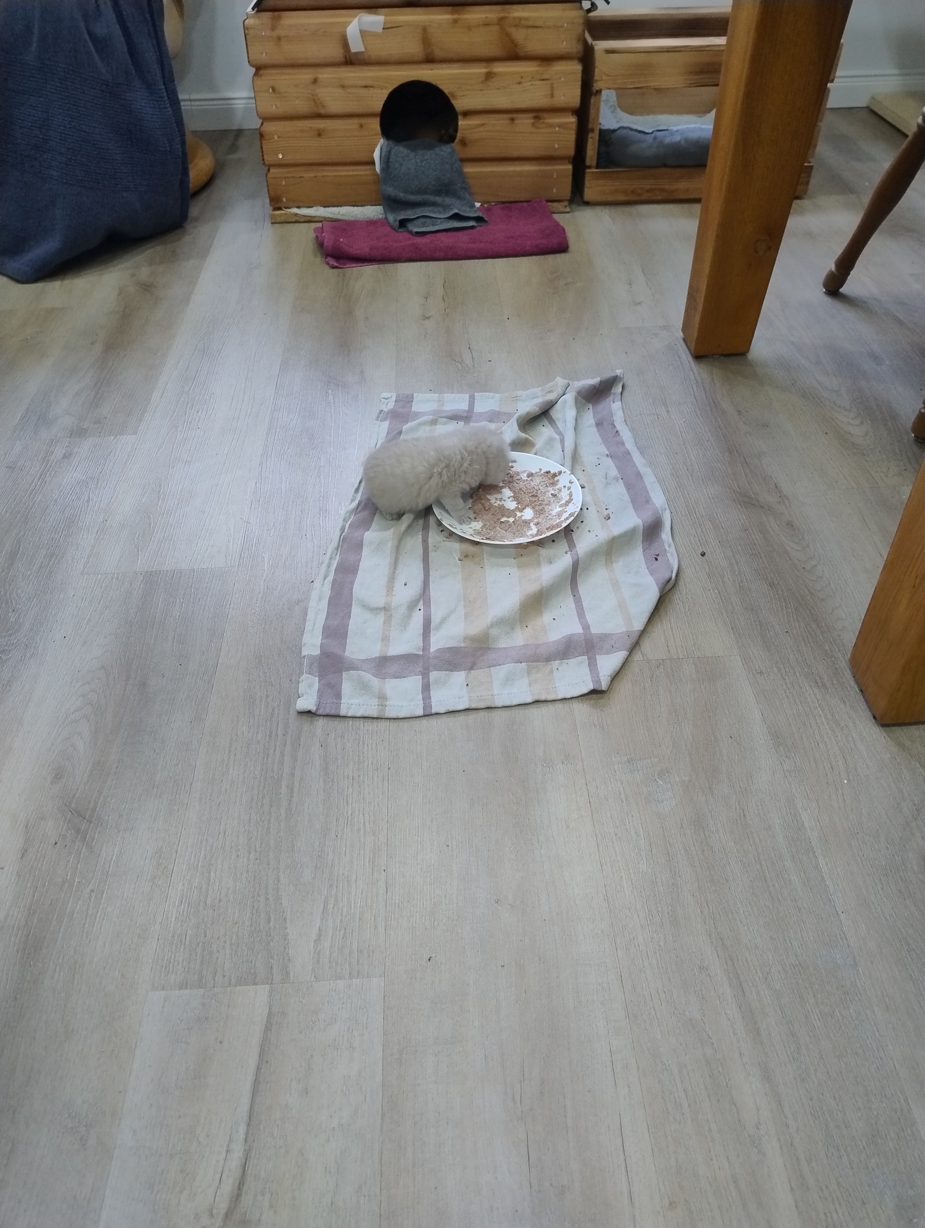 Unsere kleinen G-BKHs sind nun nach unten gezogen und erkunden so langsam im Auslauf das Wohnzimmer. Die „großen Kleinen“ nehmen sie unter ihre Fittiche, und es wird teilweise schon vorsichtig miteinander gespielt, jedoch ist natürlich ausdauertechnisch eine große Differenz da. Unsere Jüngsten beginnen nun auch langsam, sich für Nassfutter zu interessieren. Aber auch hier hat jeder sein eigenes Tempo.