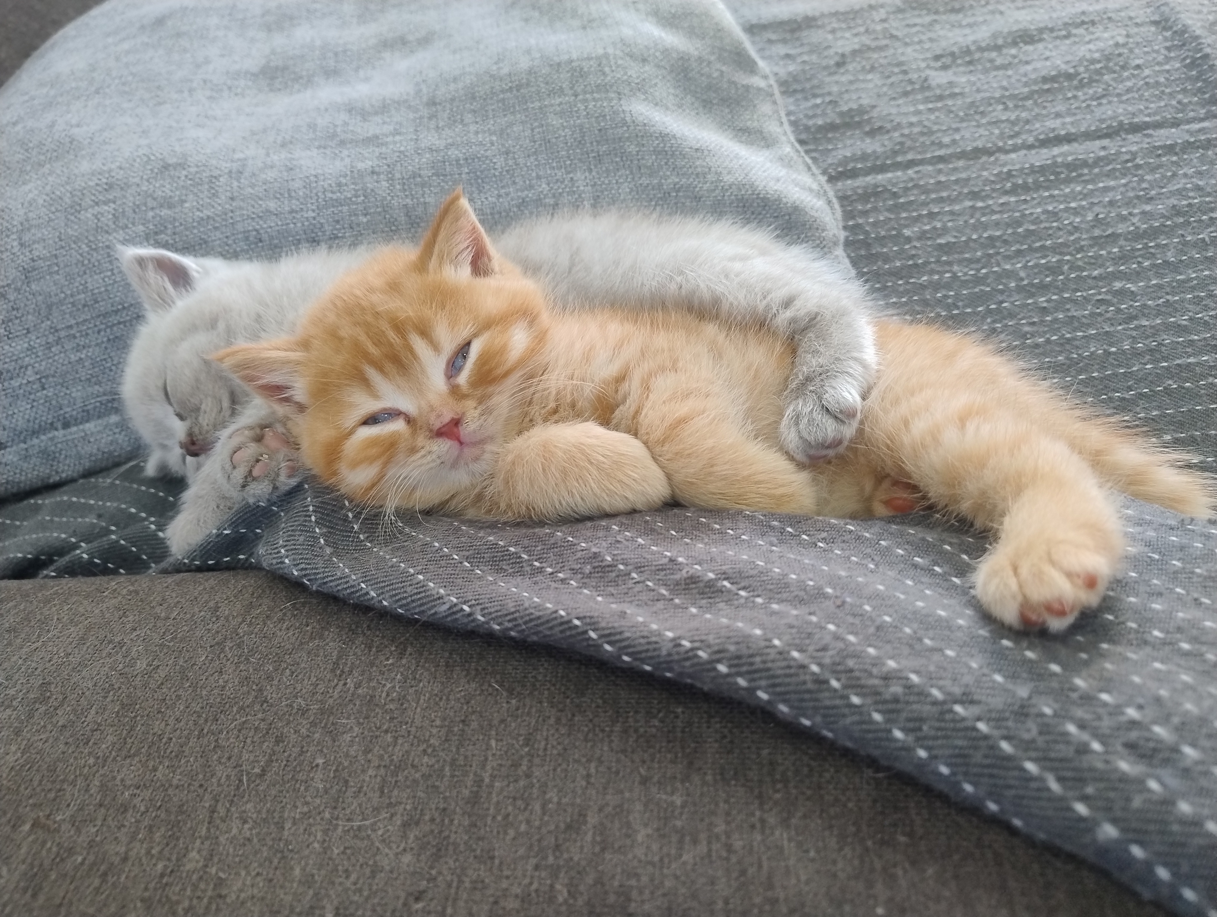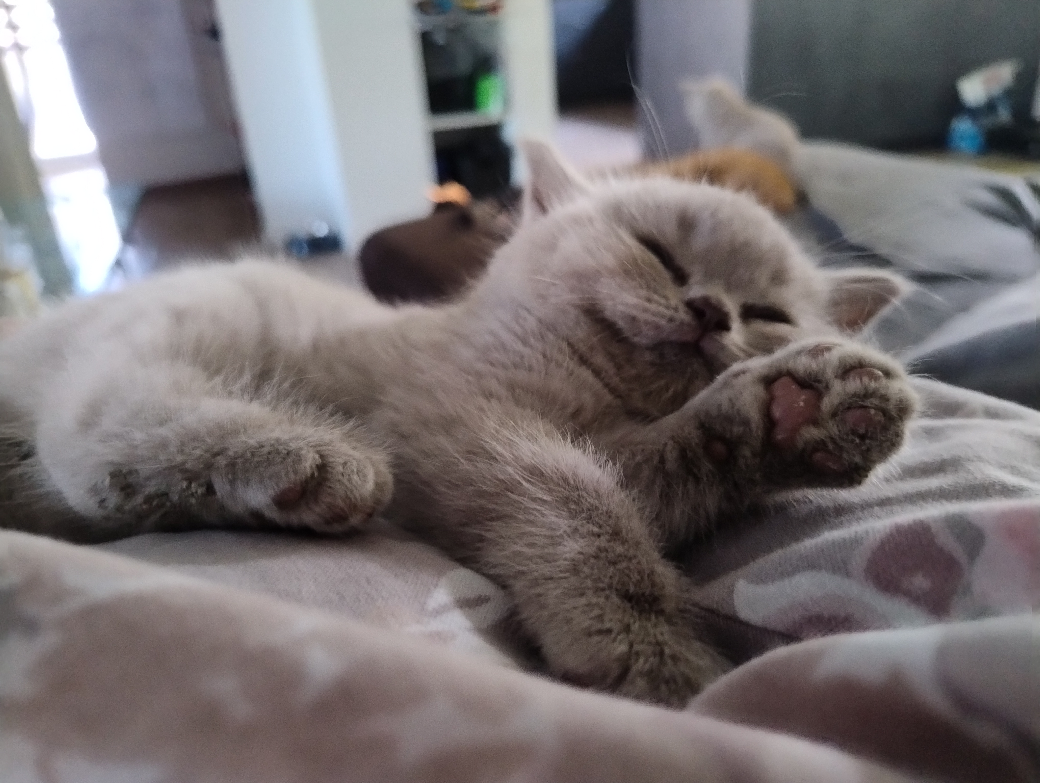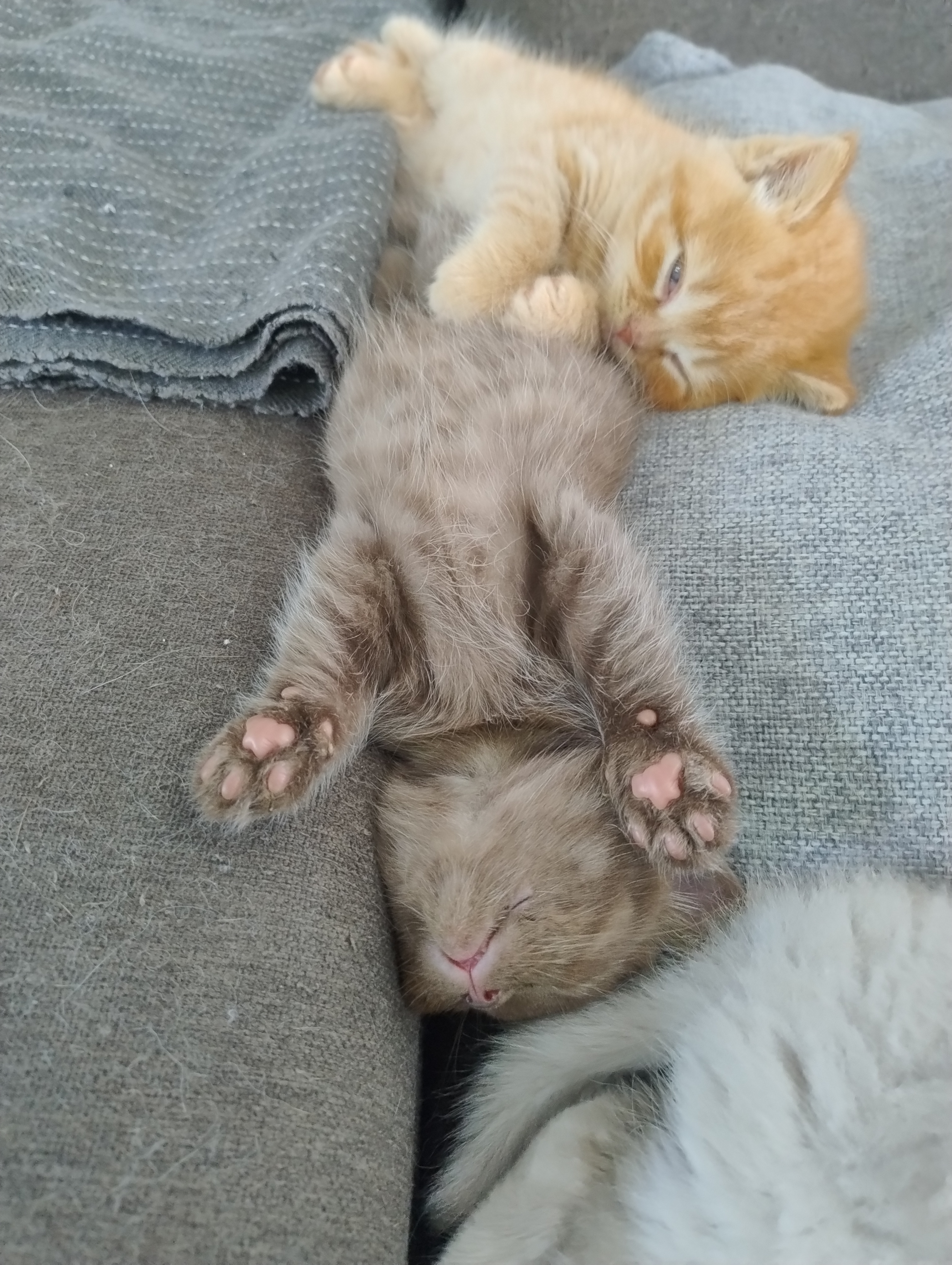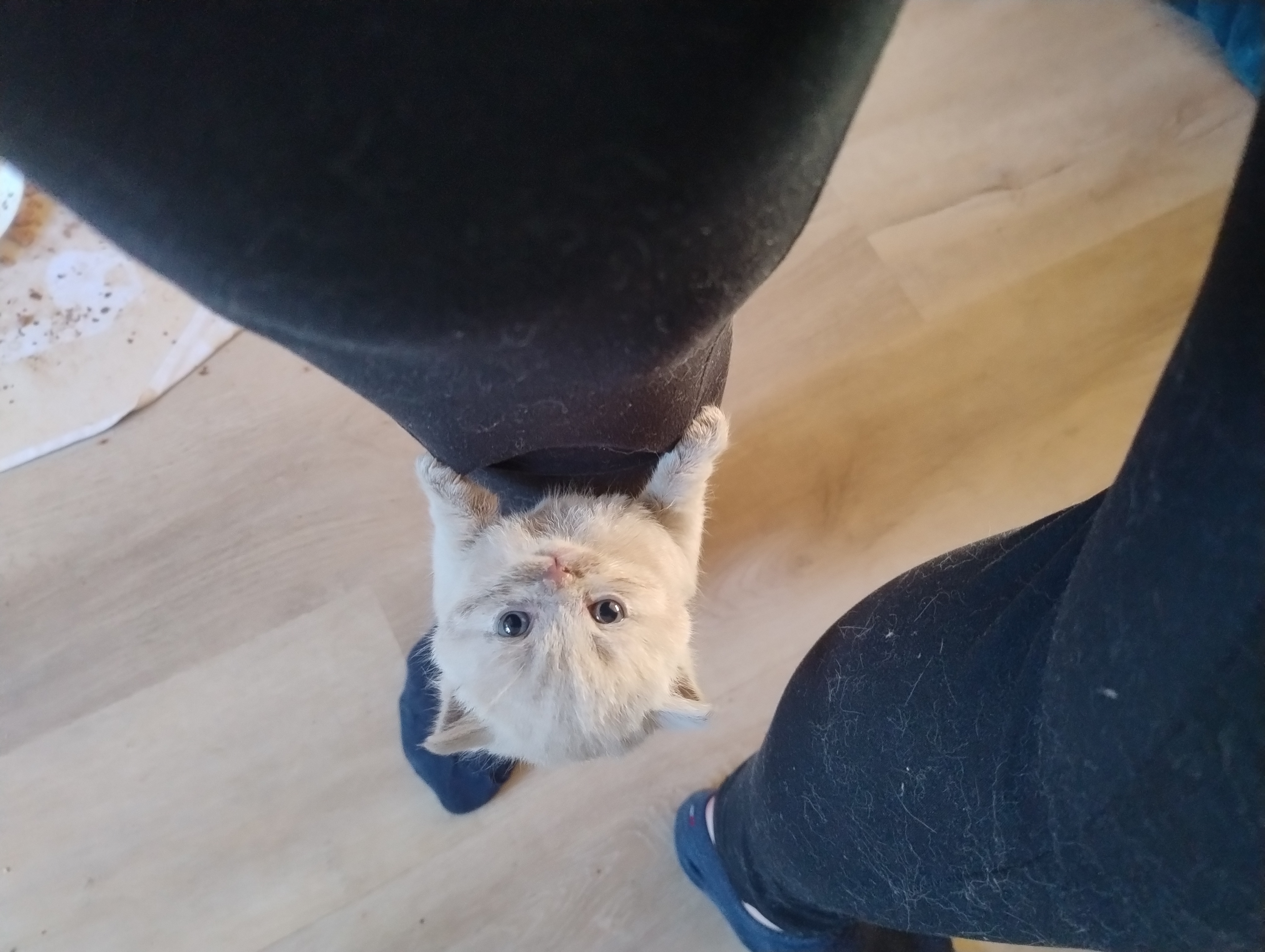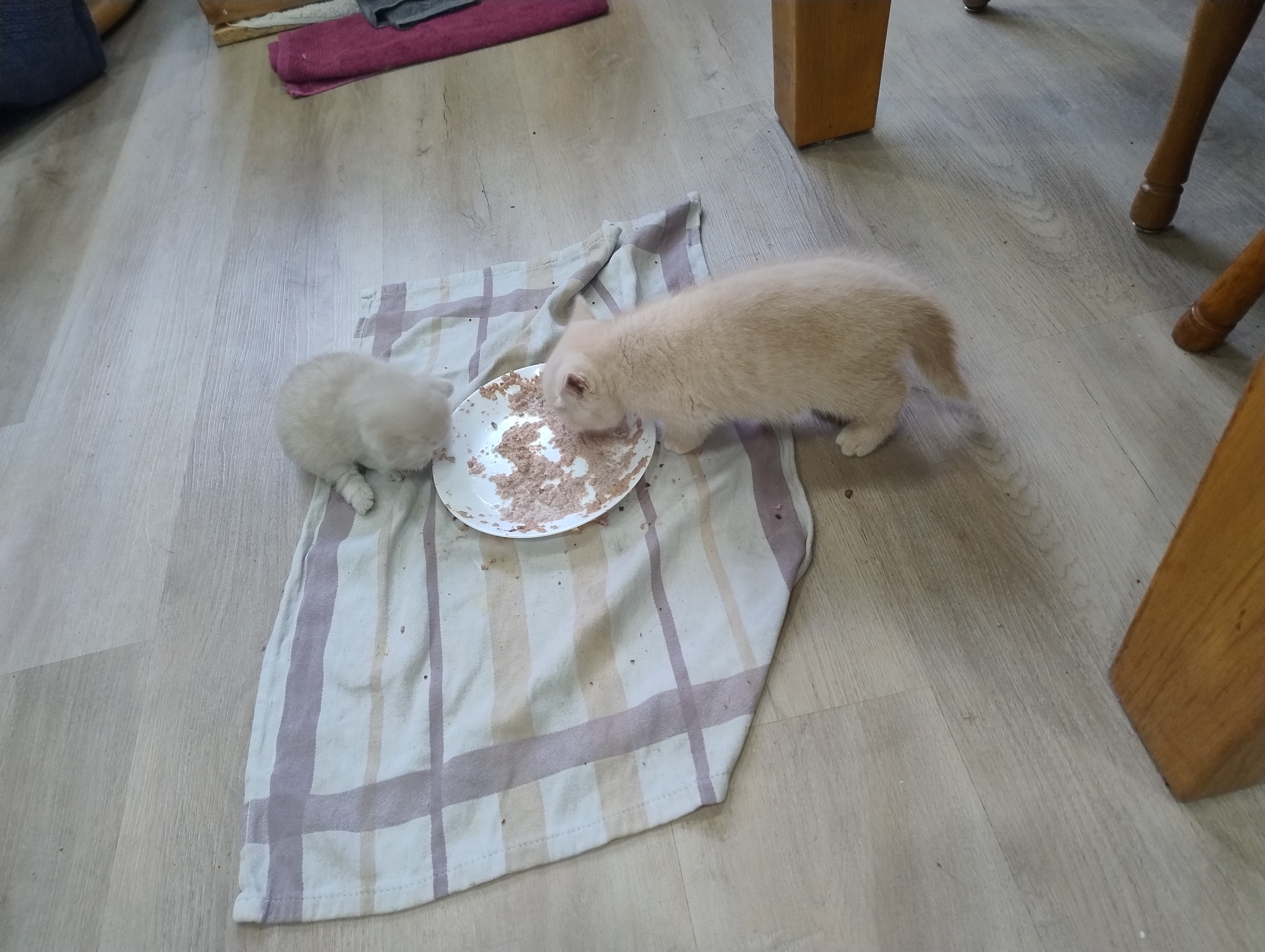 Auch bei den kleinen Kitten ist das Nassfutter mittlerweile Hauptmahlzeit, und nur zur Ergänzung mit Mama Dörte nochmal “ ausgesaugt“ ;). Der ein oder andere Toilettengang geht noch Mal daneben, aber insgesamt wissen die Kleinen schon echt gut, wie das „Stubenrein-sein“ funktioniert. Auch von den „großen-Kleinen“, also dem F-Wurf, profitieren sie: Es wird miteinander gespielt, Groß zeigt Klein wie das geht, was zu viel ist etc.