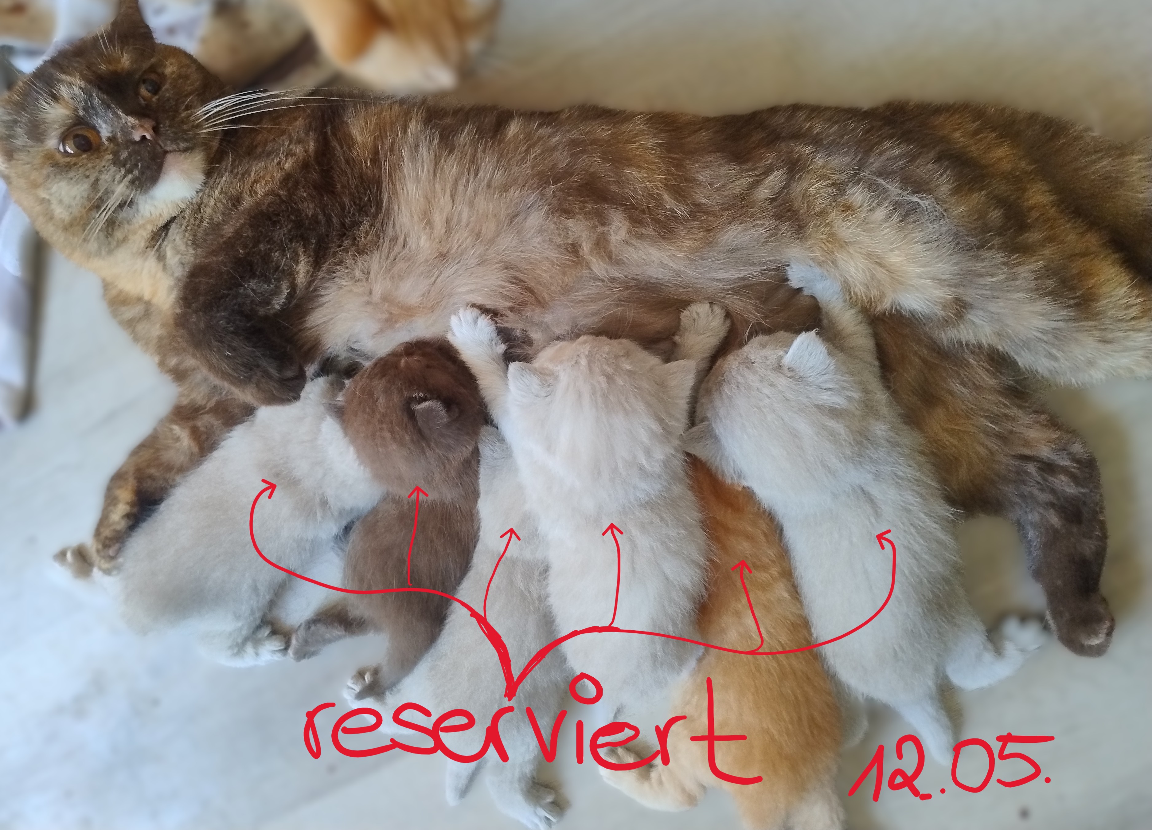 Es ist geschafft, Dörte hat uns kleine Aprilscherze beschert 🙂 Es sind sechs kleine BKHs geworden. Sie brauchte bei der Geburt auf jeden Fall viel Beistand, ich musste immer im Raum sein sonst wurde sie nervös. Ansonsten hat sie aber alles allein geschafft und auch die Wurfbox perfekt angenommen. Bisher nehmen die Kleinen wunderbar zu und liegen gut im Gewicht. Es sind 4 lilac, 1 red und ein chocolate Kitten geworden 🙂