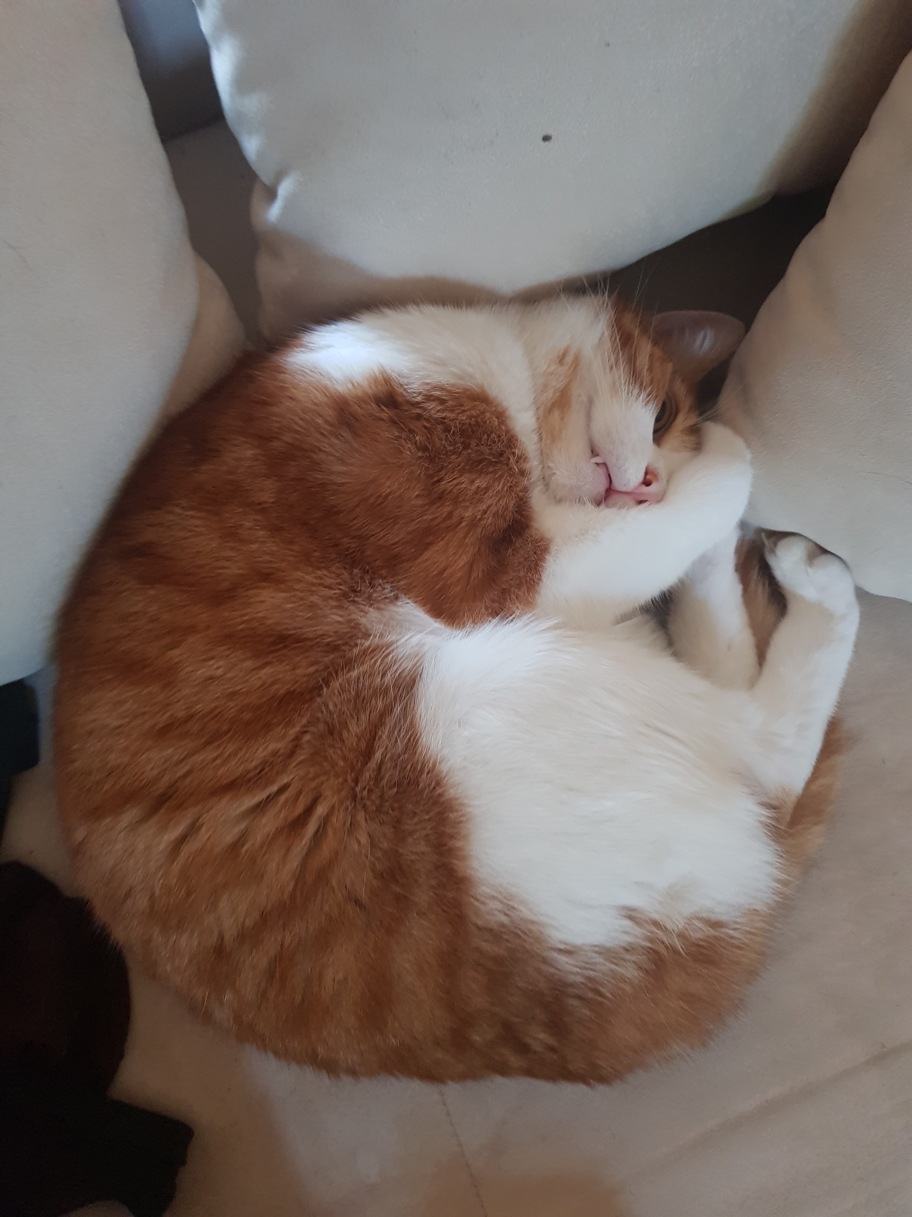 Mit seinem Weiß-orangem Fell sticht er in unserer Truppe deutlich heraus, aber gehört trotzdem nicht weniger dazu. Ernest wird von uns au h immer liebevoll, “ der Onkel“ genannt, da er sich um die Kitten wie auch um die erwachsenen Ladys bezaubernd kümmert, sie putzt und bei Streitigkeiten dazwischen geht und schlichtet.